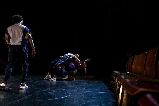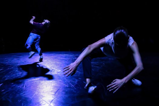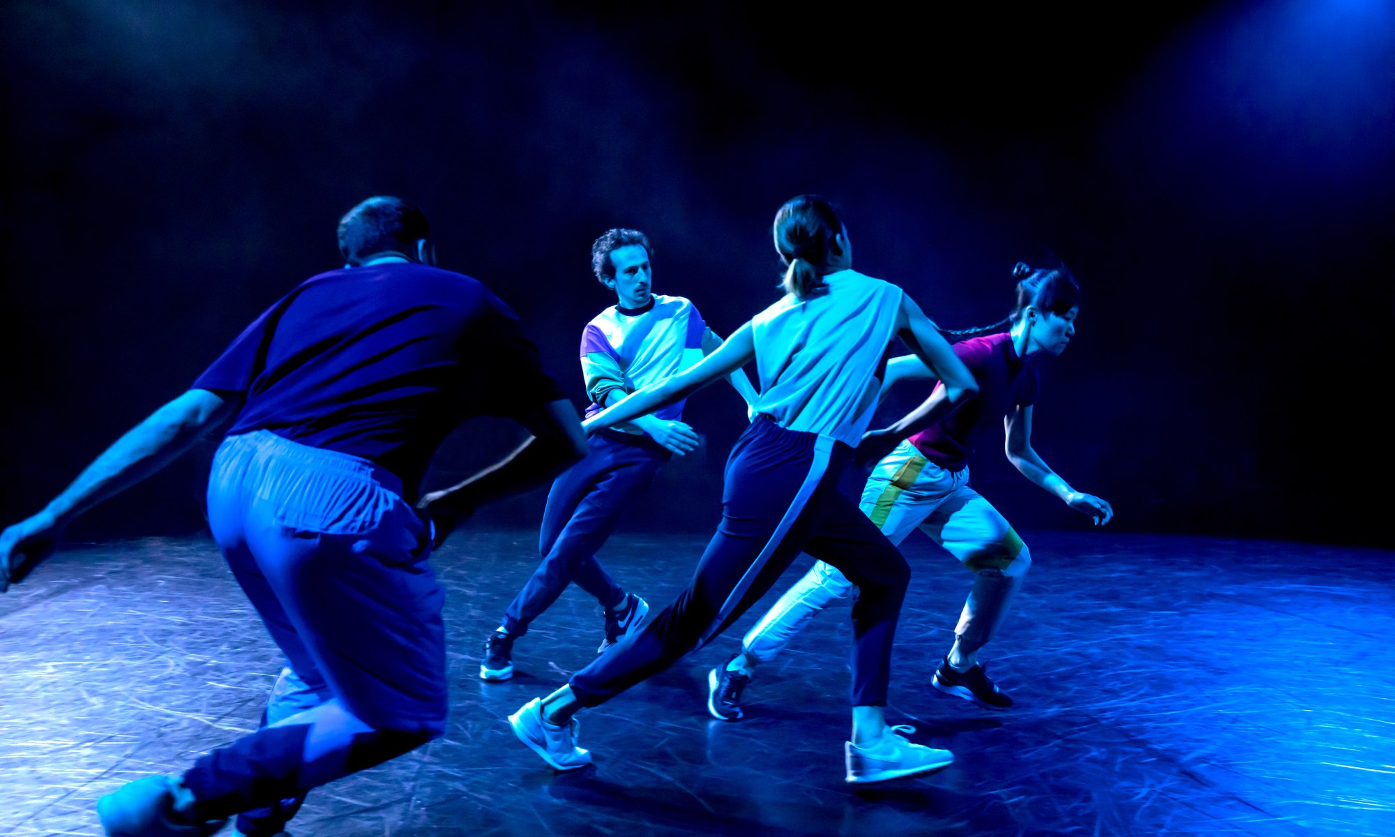 FALL(IN)<-G is a full evening performance choreographed by Michelle Cheung, Jonas Frey, Julie Pecard and Joseph Simon as a collective. They explored falling as a physical and mental state of being working closely with the surround sound installation created by Steffen Dix and Peter Hinz. Fall(in)g is a fully immersive performance where the audience encircles the action.